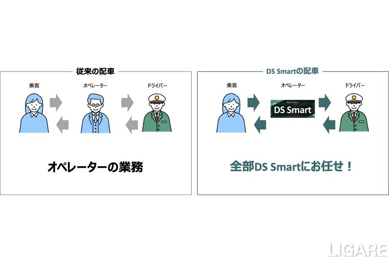 今回発表したサービスは、タクシー配車の自動化を図る「DS Smart」と、タクシーのビジネス(法人)利用を推進する「DS Taxi Call」だ。「DS Smart」は、電話からの配車依頼も、スマホアプリからの配車依頼も、オペレーターの業務負担を削減し、タクシー配車業務に必要なシチュエーションとプロセスに対応し自動化を実現する。こちらの機能は、3月1日から予約受付開始の予定だ。一方、「DS Taxi Call」では、タクシーの法人利用時における配車注文を実現し、事業者の未収(売掛)管理とも連携する。こちらの機能は5月下旬に提供開始するという。