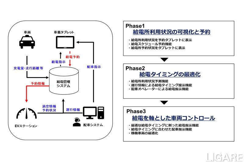 具体的には、「配車システムと連携した給電管理システムを構築し、BEV運用上の給電最適タイミングを実証(以下、給電最適タイミング実証)」と「データを基に最適な車両・設備の配置を行い、全体最適化に向けた実証(以下、全体最適化実証)」を実施する。「給電最適タイミング実証」では、地域ごとにBEV※を効率良く給電させるために給電設備の利用状況を可視化し、給電タイミングの効率化を図っていく。また、給電を軸とした配車指示などオペレーションを基に給電の最適化を図る。