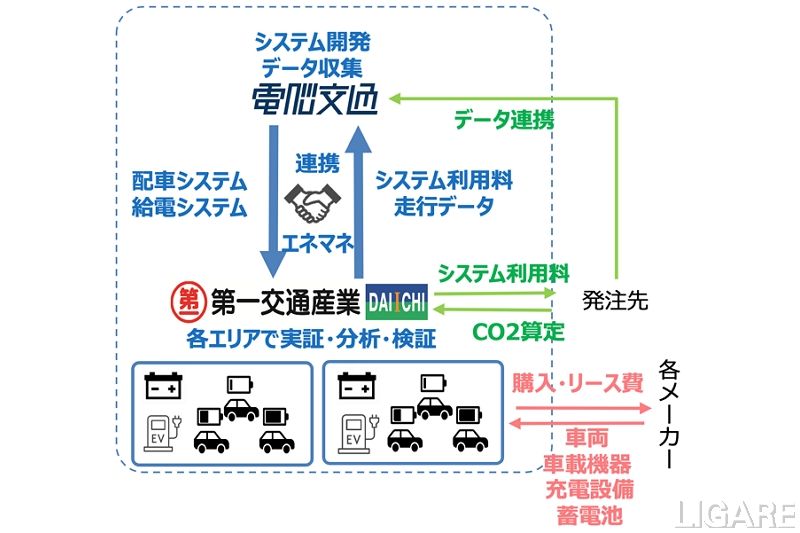 同事業は、第一交通と電脳交通が連携し、広島県および和歌山県で各エリアの特性に合わせ、配車システムをコアとした運行の効率化と給電タイミングの最適化を行う。電動車の商用利用は、主に航続距離の不足と給電時間の長さといった課題により導入・利用が進んでいない。これらの課題を解決するため、システム構築とデータを基に最適な車両・設備の配置を行い、全体最適化を行う。
