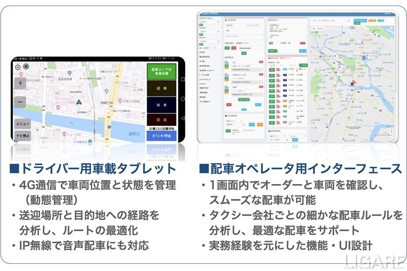 左:事業者向けに提供しているクラウド型配車システム、右:連携する自治体と開発したサービス
