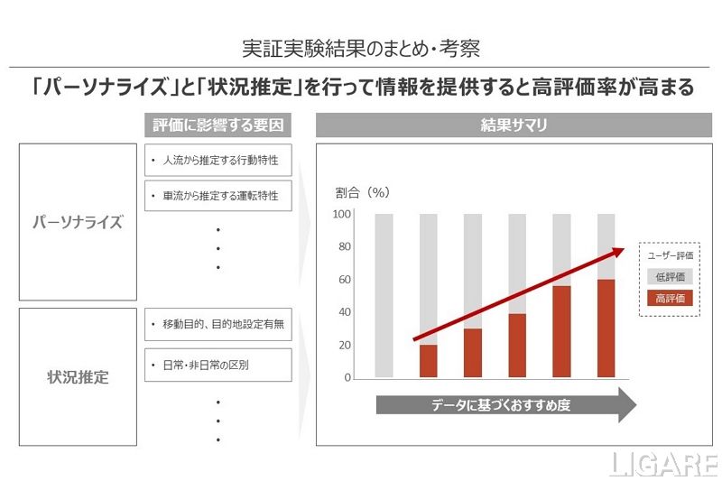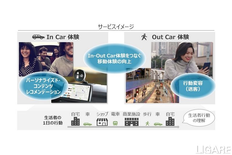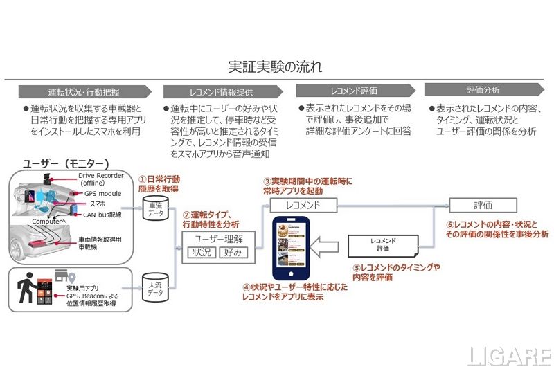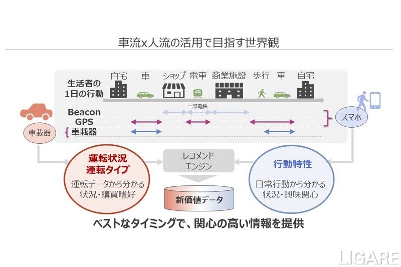 デンソーとNTTデータは、モビリティでの移動と目的地をつなぐサービスにおいて両社が協業することの強みに着目し、車流データと人流データを活用した移動体験変革の実証実験を行った。車流データと人流データから個人の特性を分析し、「運転状況の推定」と「個人の好みを把握」した店舗情報のレコメンドする。モニターに対する3カ月の車両走行検証の結果、レコメンドの有効性を確認した。車流データは、移動体験・サービスの質向上、人々の行動変容にともなう見込み客の送客支援の提供を実現するために、車載器から収集した運転特性や運転状況などのデータだ。人流データは、スマホのGPSやBeacon反応ログなどから収集している。