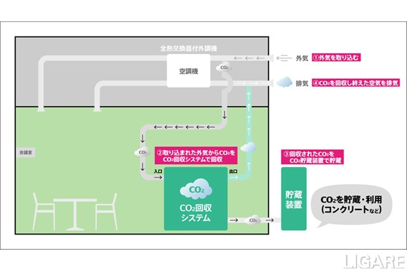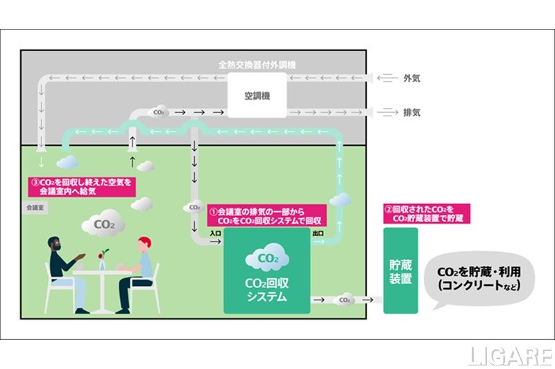 くわえて、同システムの適用により、会議室使用時の排気からCO2を回収し、CO2濃度の低い空気を再度会議室内に給気。一方、会議室未使用時は、大気中のCO2を外気から回収する。回収したCO2は環境配慮コンクリート「T-eConcrete※」に固定する実験などに利用するという。なお、両社は、今後同検証による成果を踏まえ建物への実装を推進することで、共にカーボンニュートラル社会の実現に貢献していくと述べている。