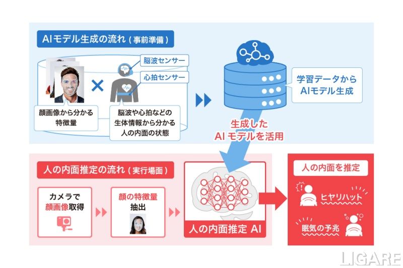 同技術では、まず、脳波や心拍などの生体情報から分かる‟ヒヤリとする、ハッとする”や‟頭がぼんやりする”といった人の内面の状態と、その時の顔画像から眉・目・鼻・口といった顔のパーツの位置や形をあらわす特徴量との関係をAIモデルとして生成する。次に、カメラで取得した顔画像から特徴量を抽出し、このAIモデルと照合することで、人の内面推定が可能となる。