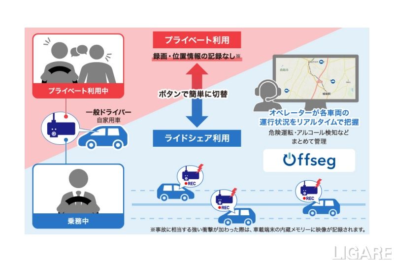 デンソーテンは5月13日、同社提供の通信型ドライブレコーダーを活用した安全運転管理テレマティクスサービス「Offseg(オフセグ)」が、富山県南砺市(以下、南砺市)の公共ライドシェア「なんモビ」に採用されたと発表。南砺市が公募した一般ドライバーの自家用車にOffsegのドライブレコーダーが装着されるという。