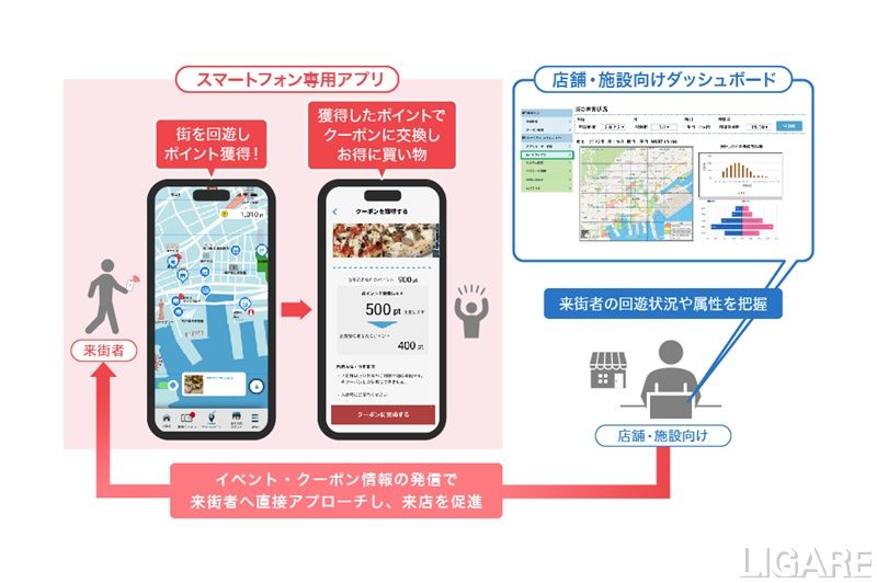 くわえて、同実証では、店舗・施設向けにはWebブラウザで来街者の回遊状況をリアルタイムで閲覧できるダッシュボード機能を新たに開発し導入する。これにより、店舗や商店街、施設の担当者がダッシュボードを確認しながら、来店率が低い時期・時間帯に合わせてタイムリーにクーポンを発行するができる。これにより、効率的な集客につながる見込みだ。