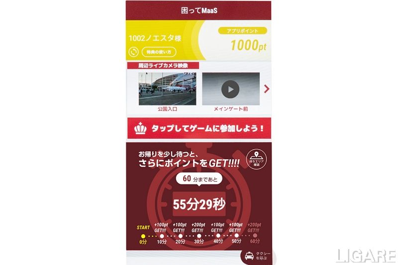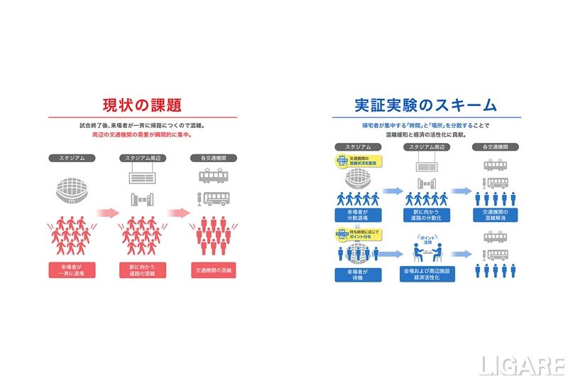 ポイントは、試合終了後に指定のエリア内で待機することで、時間に応じたポイント数が付与される。このポイントは、スタジアム内のグッズ販売店や会場周辺の提携店舗で使用可能なクーポンと交換できる。ユーザーの待機行動と提携店舗への誘引を促し、混雑緩和と会場周辺の経済活性化の両立を図る。