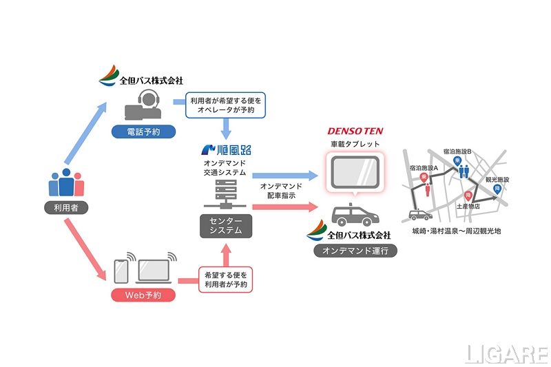 株式会社デンソーテン(以下、デンソーテン)、全但バス株式会社(以下、全但バス)、順風路株式会社(以下、順風路)は、オンデマンド交通の実証実験を11月1日から開始した。11月4日付のプレスリリースで明かしている。兵庫県の城崎・湯村温泉エリアにて、観光客をターゲットとして実施する。