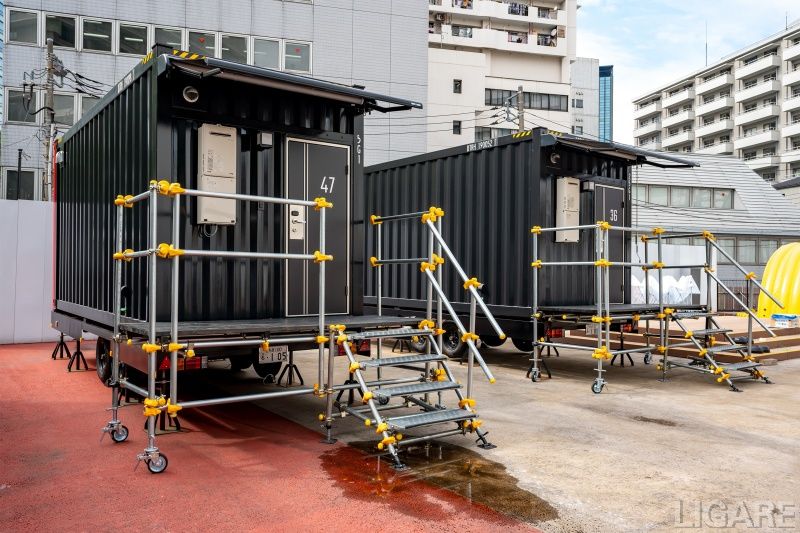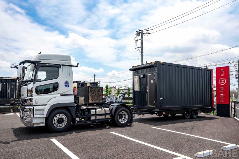 レスキューホテルには、車輪のついたシャーシ上にコンテナを配置したまま運営する「車両型」と、コンテナをシャーシから下ろし、地面に固定して運営する「建築型」がある。今回オープンする「HOTEL R9 The Yard 阿見」は「車両型」で運営する。