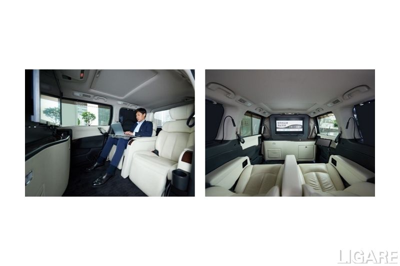 今回の実証実験では、事業化に向けたハイヤーサービスの新しいビジネスモデルの確立と、そのために必要な車内空間の仕様や車載品の進化や高度化を目指す。対象範囲は東京都23区域内、および神奈川県横浜市内・川崎市内・横須賀市内で、2月17日~9月30日に実施する。日産のエルグランド(VIP 2列シート)を活用し、車内には32インチの液晶モニター、前席と後席の間の隔壁(遮音機能あり)、会議専用のカメラ/スピーカー/マイク、Web会議用の通信ネットワーク(5G、4G対応)などを搭載した。