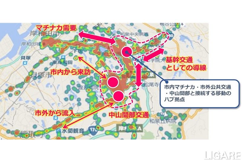 近年、国内の人口動態の変化や、加齢等による身体的機能の衰えなどによって鉄道の駅やバス停に行くことが困難になるなど、公共交通機関での移動に不便を感じる生活者が増える傾向にある。こうした状況に対して、岸和田市は、泉州山手線の整備と沿道のまちづくりの一環として、山直東の新拠点交通広場を中心とした「移動がスムーズなまちづくり」に取り組んでいる。