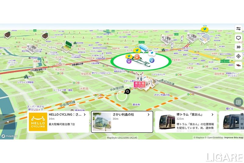 さらに、自動運転車両(バス)の発着場所となる「さかい利晶の杜」に、地図をベースに地域や施設等の魅力を発信する「DNP MAPベース地域振興情報発信プラットフォーム」を活用したデジタルサイネージを設置する。このサイネージには、周辺地域の店舗やイベント情報のほか、自動運転車両(バス)の運行状況を地図上に表示する。これにより、店舗・施設の利用や観光の促進、スムーズな交通手段の利用促進などにつなげていく予定だ。利用者は、ディスプレイに表示されたQRコードを読み取ると、自身のスマートフォンで情報を閲覧できる。
