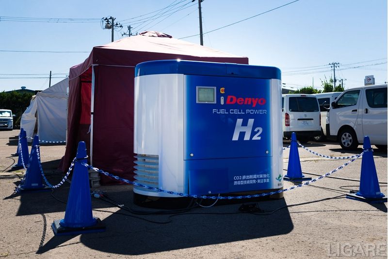 「ドライブインシアター2021 inトヨタカローラ秋田」では、燃料電池電源車、燃料電池式可搬形発電装置と FCVのMIRAI からの電力供給を行った。燃料電池電源車と燃料電池式可搬形発電装置は、デンヨー株式会社、トヨタ自動車株式会社が「CO2排出削減対策強化誘導型技術開発・実証事業」として取り組んでいるものだ。