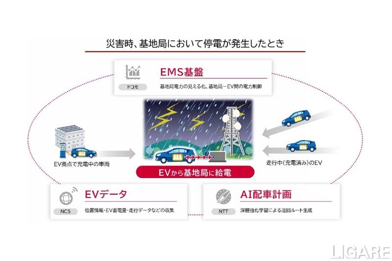 ドコモら3社、EVを活用した基地局電源救済システムの実証開始