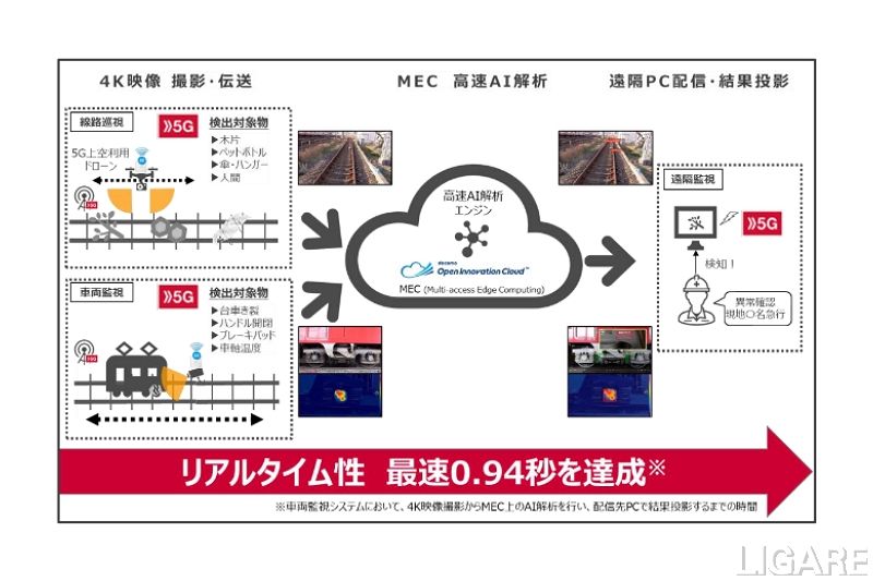 具体的な流れは、4K映像を5Gで伝送し、網内クラウド環境(MEC)で高速AIディープラーニングにより解析し、解析結果を遠隔地にリアルタイム配信するというものだ。通常時の車両監視と災害時を想定した線路点検を対象とし、2020年12月~2021年2月に京急電鉄の久里浜工場で実施した。