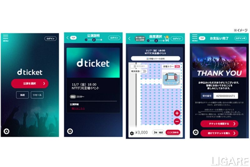 同サービスは、全国で開催される音楽コンサートやスポーツイベントなどの興行チケットを、スマートフォンやパソコンから購入できるサービスだ。dアカウントとの連携が可能なため、追加の情報登録の手間がなくスムーズなログインができるほか、チケット購入時に希望する座席からの見え方が確認できる。購入後の座席変更や入場前後のアップグレードにも対応し、また電子チケットによる非接触入場も可能だ。さらに、チケット購入の手続きにあわせてグッズを購入できるという。