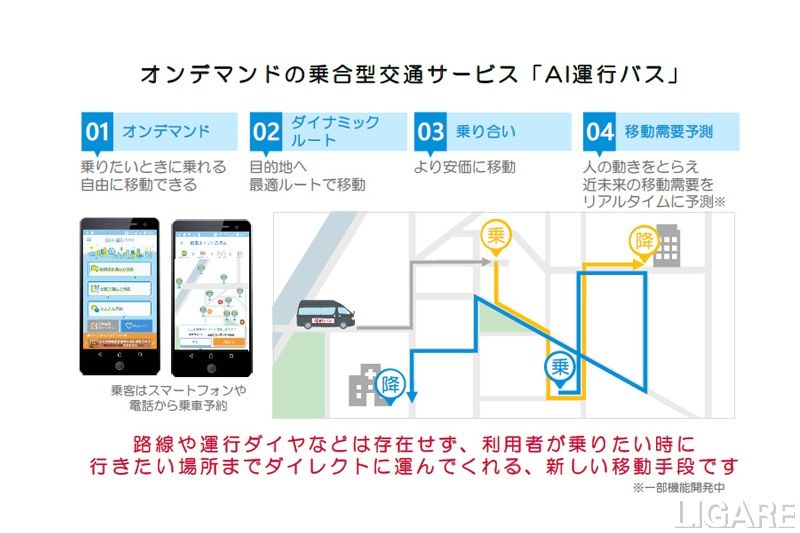 ※1 AI運行バスとは、人工知能(AI)によるリアルタイム処理の活用により、需要に応じ、最適な時間、ルートで、最適な運行を行う、NTTドコモの提供するオンデマンドモビリティサービスのサービス名称。