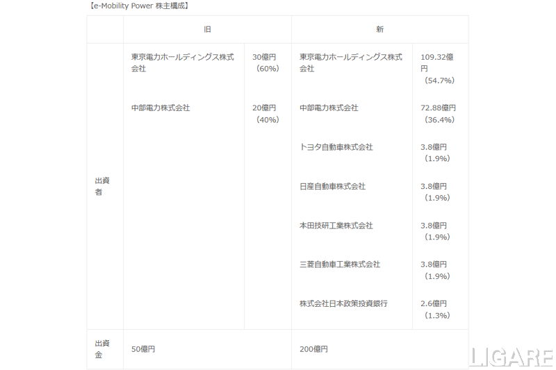 東京電力ホールディングス(以下、東京電力HD)、中部電力株式会社(以下、中部電力)、ならびにトヨタ自動車株式会社(以下、トヨタ)、日産自動車株式会社(以下、日産)、本田技研工業株式会社(以下、ホンダ)、三菱自動車工業株式会社(以下、三菱自動車)の自動車メーカー4社、および株式会社日本政策投資銀行(以下、日本政策投資銀行)の7社は5日、e-Mobility Powerの新たな株主構成を発表した。e-Mobility Powerの総額150億円の第三者割当増資による株式を引き受け、東京電力HDと中部電力が増資、自動車メーカー4社と日本政策投資銀行が新規に出資する。