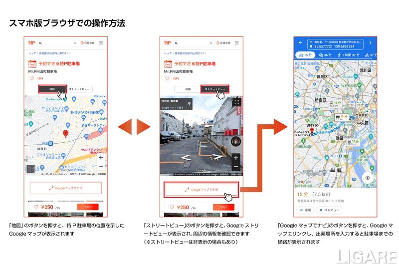 特Pは、会員が予約した駐車場の案内方法については、周辺の画像や見取り図の掲載にくわえ、詳細な所在地を画面の地図上に表示し、Googleマップの経路案内にリンクするボタンも付与していた。しかし、場所が分かりづらい駐車場には会員がたどり着けず、コールセンターが問い合わせを受けるケースもあったという。