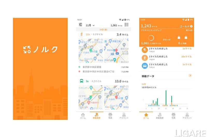 「ノルク」は、ユーザーが移動した距離と手段に対応した“マイル”を付与し、たまったマイルに応じてさまざまな特典を提供するスマートフォン向けアプリだ。イーデザイン損保は、「ノルク」の提供により、健康でエコな移動を促進。同時に、交通手段の最適化を推進し安心・安全なモビリティ社会の実現を目指す。