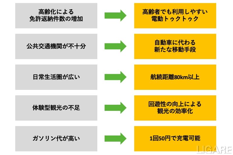今回の事業では、電動トゥクトゥクを移動手段としての役割に限らず、モビリティの新たな活用可能性を検証し、未来のモビリティ・サービスのあり方を模索する。搭載したIoTデバイス・サイネージを駆使し、「地図データ作成」、「経路探索システム構築」、「オペレーション/ビジネスモデルの構築」、「サイネージ広告(車内、車外用)」「災害時の非常用電源としての小型電動モビリティの活用可能性」「VR映像データを活用したバーチャル観光体験」を検証予定だ。なお、エモビは、小型EVとの相性が抜群な離島で地元のステークホルダーも巻き込んだ事業展開を行い、地域を活性化させると述べている。