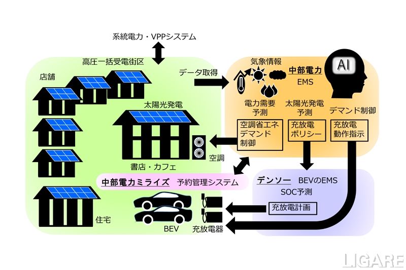 同取り組みは、中部電力、中部電力ミライズ株式会社(以下、中部電力ミライズ)、および株式会社デンソーの3社で実施する。中部電力ミライズは、カルチュア・コンビニエンス・クラブ株式会社と共同で、「Karuizawa Commongrounds」内の書店やカフェなどの店舗、近隣の居住エリアに太陽光発電設備を設置。同時に、充放電機能を有するBEVを導入する。このBEVは、コミュニティの利用者を対象としたカーシェアの車両、およびコミュニティ内の電気の需給に合わせて、再生可能エネルギーを充放電する蓄電池として活用される。