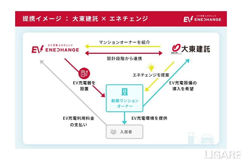 ENECHANGE株式会社(以下、エネチェンジ)と大東建託株式会社(以下、大東建託)は11月7日、新築マンションへエネチェンジのEV充電器を設置推進する協業合意を発表した。