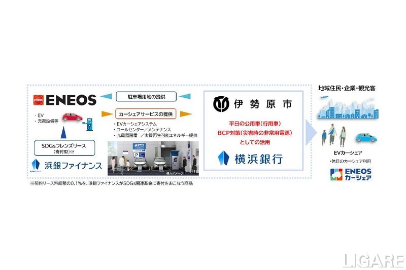 ENEOS株式会社(以下、ENEOS)ら4者は5月23日、「伊勢原市ゼロカーボン・ドライブ※の普及促進に係る連携協定」を締結。同協定に基づき神奈川県伊勢原市(以下、伊勢原市)や株式会社横浜銀行(以下、横浜銀行)へのEVカーシェア導入を決定した。