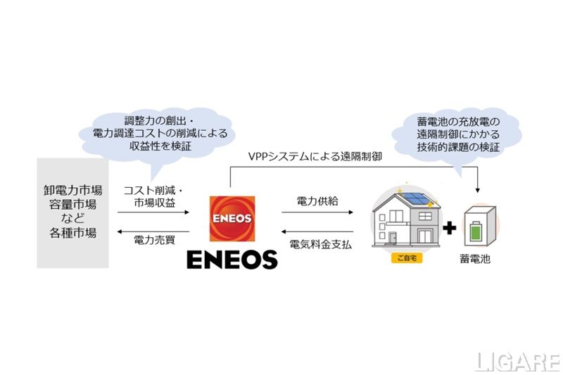 今回の実証では、VPP事業体制の構築に向けた取り組みの一環として、ENEOSのVPPシステムを用いて家庭用蓄電池の遠隔制御等に関する技術検証を実施する。同時に、調整力の創出や電力調達コストの削減による収益性についても検証し、事業化に向けて検討を進めていくという。