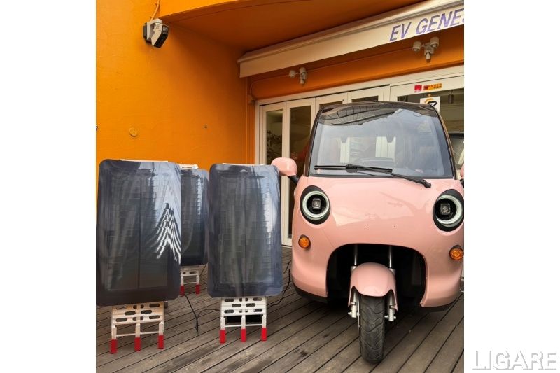 EVジェネシス株式会社(以下、EVジェネシス)は1月29日、ペロブスカイトソーラーパネルをルーフに装着した小型EV三輪車と何枚もの外付けしたペロブスカイトソーラーパネル(以下、外付けペロブスカイトソーラーパネル)を組み合わせた「小さな小さな発電所」ユニット開発を発表した。