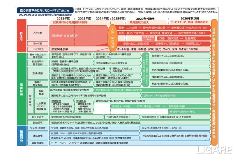 両省は、空飛ぶクルマの社会実装に向けた構想を具体化し、日本における新しいサービスとして発展させていくために、2018年12月に「空の移動革命に向けたロードマップ」をとりまとめた。さらに、2020年8月より実務者会合を設置しユースケースの検討や制度整備に係る具体的な議論を進めてきている。