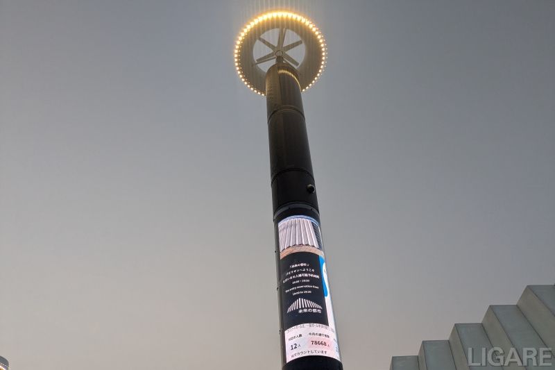 特に注目したいのが、屋外に展示しているスマートポールだ。柱部分にはペロブスカイト太陽電池(積水化学工業製)、巻き付け型のデジタルサイネージ、スマートフォンの充電機能、人流分析や子どもの見守りが可能なAIカメラなど、多種多様な機能を一体化している。今回は実装していないものの、頂点部分には風力発電設備や、非接触充電に対応するドローンポートの設置も可能だという。