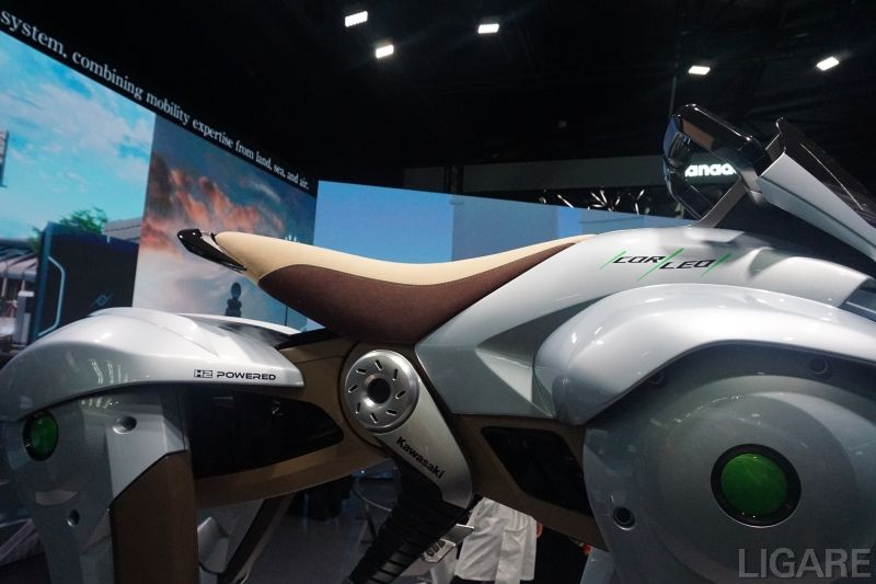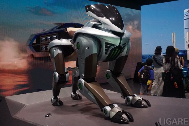 もう一つの展示「CORLEO(コルレオ)」は、四足で立つ動物の姿を模したモビリティだ。「ペットロボットのような愛玩具ではなく、あくまで『愛車』という位置付けです。随所にバイクの機構が盛り込まれています」と担当者は強調する。
