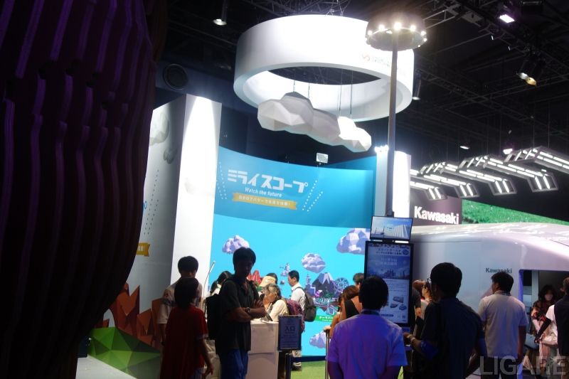 水素のエネルギー活用については、商船三井による次世代ゼロエミッション船「ウインドハンター」の展示でも見られる。パビリオンでは長さ約4メートル、高さ約3メートルの精巧な模型が展示され、隣接する川崎重工との連携により、両社のスクリーンを合わせた長さ17メートルの巨大画面でムービーが投影されていた。