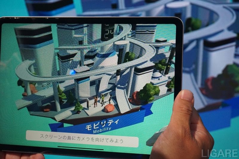 関西電力送配電は、未来の都市パビリオンの内外に次世代インフラ「スマートポール」を展示している。ここでいうスマートポールとは、街路灯・通信・監視・情報配信などの機能を統合した次世代インフラを指す。都市機能を拡張するプラットフォームとして、同社が実用化に向けて取り組んでいる。パビリオンの来場者は、まずブース内のタブレットで自身のアバターを作成。アバターが「モビリティの島」、「アドベンチャーの島」、「テーマパークの島」という3つのテーマに基づいたフィールドで、スマートポールが未来社会でどう役立つのかをバーチャルで体験できる。