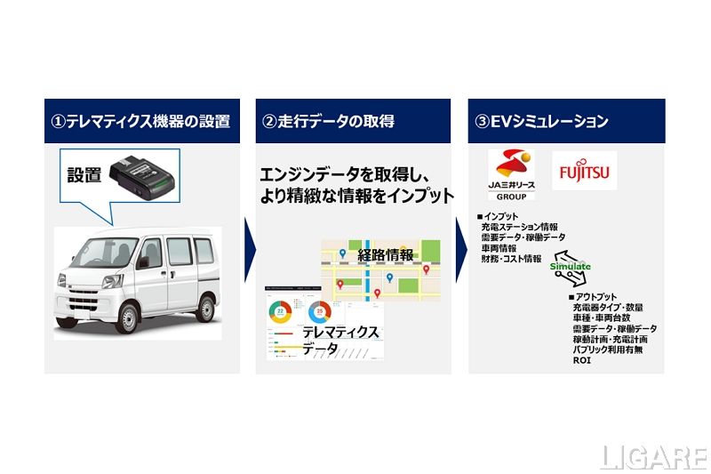 JA三井リース株式会社(以下、JA三井リース)と富士通株式会社(以下、富士通)は11月12日、全国の農業協同組合(以下、JA)が使用する車両を活用した共同実証実験を10月15日より開始したことを発表。商用車のEV化と普及に向けて取り組むという。