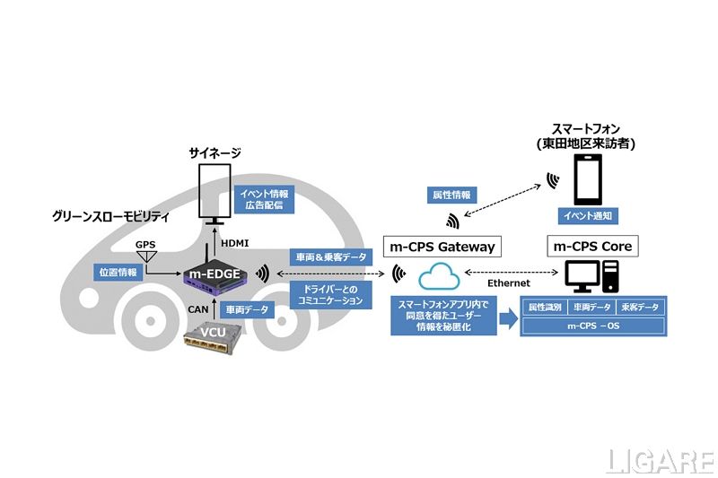 また、同社は、搭載したユニットにより、グリーンスローモビリティに乗車しているユーザーのデータや車両の稼働状況を把握する。そして、把握したデータを「m-CPS」(mobility-Cyber Physical System)により可視化し、個々のユーザーに応じたサイネージ広告を配信する予定だ。