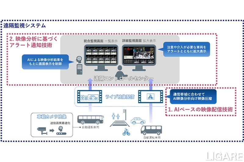 遠隔監視システムの検証は、NECのAIベースの映像配信技術と映像分析に基づくアラート通知技術を活用する。これにより、1名のオペレーターによる複数台の自動運転バスの効率的な監視が可能だ。自動運転バスの遠隔操作は、群馬大学研究・産学連携推進機構次世代モビリティ社会実装研究センター(以下、CRANTS)が同センター内の試験路にて実施する。目的は、自動運転バスの社会実装をより意識し、複数台運行のための仕組みの検証だ。