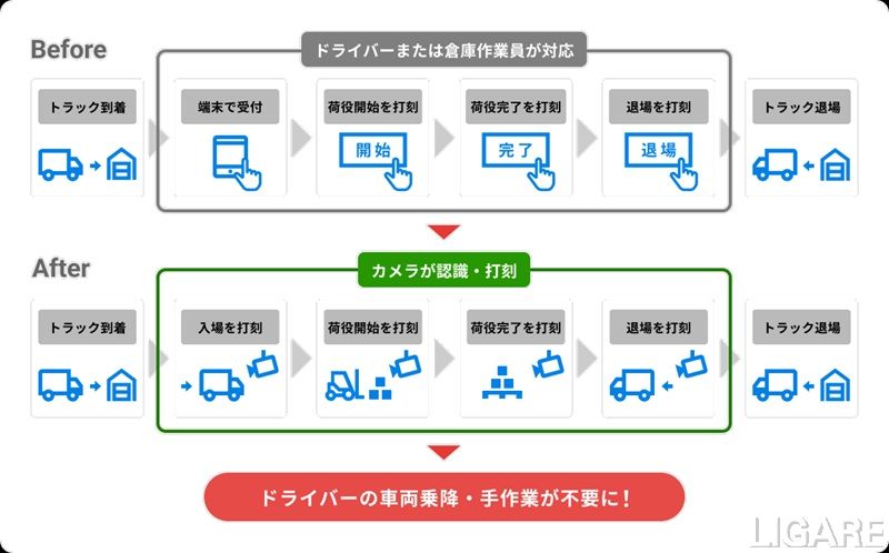 今回の連携では、このAIカメラを物流拠点に設置し、トラックのナンバープレートや動きを自動で認識。車両がゲートを通過した時刻を「入退場時刻」として、また、バースに接車・離車した時刻を「荷役作業の開始・完了時刻」として、「トラック簿」システムに自動で登録する。