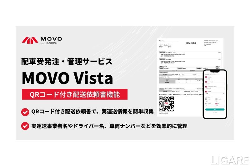 株式会社Hacobuは2月20日、配車受発注・管理サービス「MOVO Vista(ムーボ・ヴィスタ)」において、QRコード付き配送依頼書による実運送情報収集機能の提供開始を発表した。