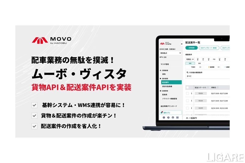 株式会社Hacobu(以下、Hacobu)は、クラウド物流管理ソリューションMOVOシリーズの中で、配送案件を管理するサービス「MOVO Vista(ムーボ・ヴィスタ)」に、貨物APIおよび配送案件APIを追加した。
