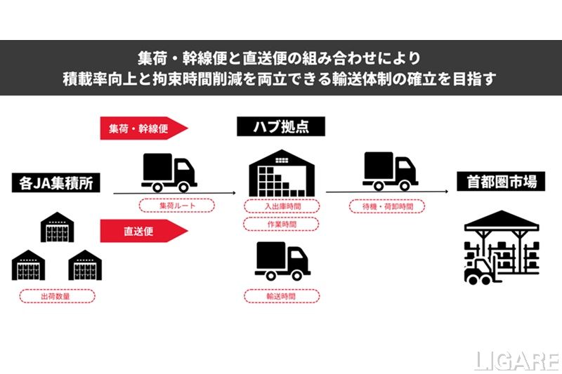 今回の実証では、各JA集積所からハブ拠点へ集約後に首都圏市場に輸送する「集荷・幹線便」、各JA集積所から立寄りなく直接首都圏市場に輸送する「直送便」の2つの輸送手段を組み合わせ、積載率向上と拘束時間削減を両立できる輸送体制の確立を目指す。