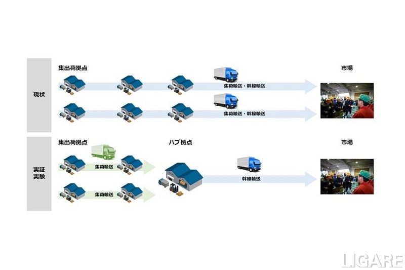実証実験は、全国農業協同組合連合会 秋田県本部の協力の下で行う。青果物の首都圏輸送のハブ拠点(中継点)を設け、集荷輸送と幹線輸送を分離する。具体的には、秋田県内のJAの集出荷拠点で青果物を集荷しハブ拠点まで輸送する車両と、ハブ拠点から首都圏への幹線輸送を行う車両を分離する。これにより、ドライバーの長時間労働を回避。あわせて、秋田県内の集荷ルートを見直し、集荷車両台数の削減を行う。