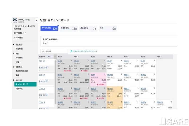 MOVO Fleetは、物流業界に特化したテレマティクスサービスだ。GPSを使った車両位置把握により、車両管理における業務負荷軽減や、配送の効率化を行うことができる。オプションである配送計画機能では、ダッシュボード上で配送計画を一覧表示し、計画に対する実績、遅れを把握。これにより、運行管理の負荷を軽減する。さらに、今回追加された「荷物・荷量管理機能」により、配送計画に配送の内容(荷物名、伝票番号、荷姿、数量等)も指示できるようになった。