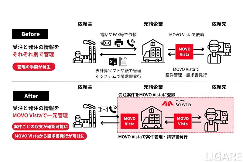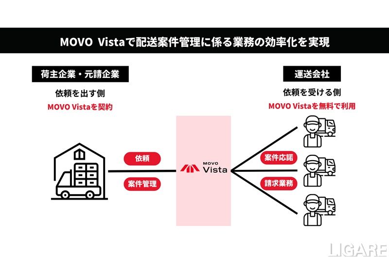 「MOVO Vista」は、荷主企業・元請企業・運送会社の企業間をつなぎ、配送案件の管理を支援する物流DXツールだ。