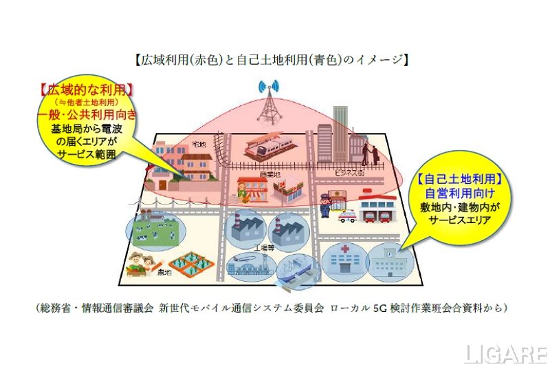 ローカル5Gの免許制度では、Sub6帯・ミリ波帯のいずれにおいても、自分の敷地や建物内での利用に限定した「自己土地利用」を基本としている。現状では、自己土地を大きく越えて他者土地まで電波エリアを広げて利用する「広域利用」は認められていない。