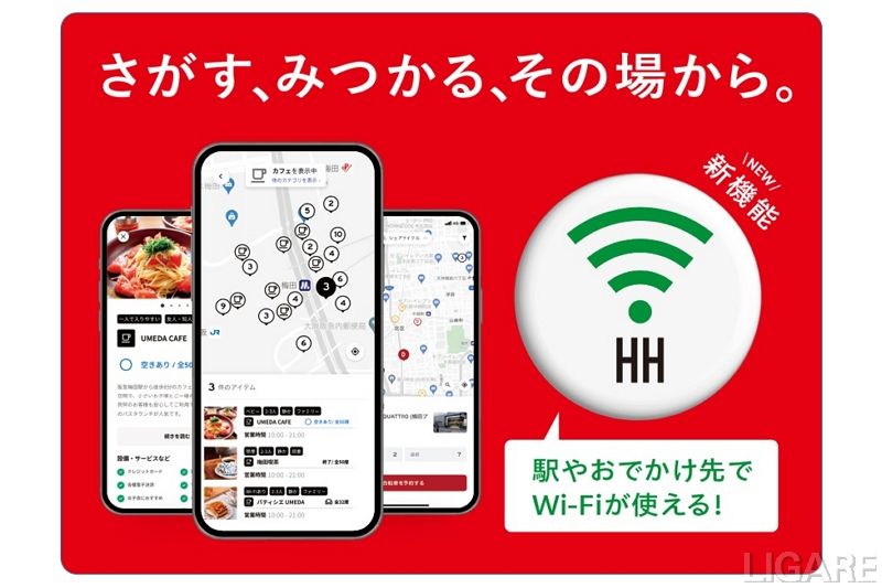 今回のアップデートの特徴は、「Wi-Fiサービスの利用」、「ドコモ・バイクシェアのシェアサイクルの予約・利用・決済」、「サービスエリア拡大」、「企画乗車券販売」などだ。「Wi-Fiサービスの利用」では、アプリ内の「Wi-Fiボタン」よりWi-Fi接続ツールを入手することで、新しくなったHH cross Wi-Fiサービスを利用できる。TOWNSアプリのマップからWi-Fiサービスの利用が可能なスポットを探すことも可能だ。