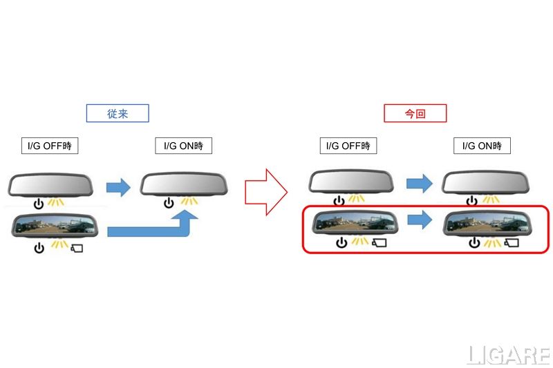 今回の改良点は、「スマートエントリーシステム導入」「ルームミラーモニター表示設定変更」「スイッチレイアウト変更」「ラジオアンテナ長の短縮」「法規対応」だ。スマートエントリーシステムにより、ポケットなどに携帯していれば、キーを取り出さずにドアの施錠・解錠ができるようになった。