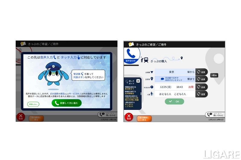 JR各社では、近年少子高齢化に伴う労働人口の減少やコロナ禍を背景に非対面によるきっぷ販売を進めている。こうした背景を受けて、鉄道情報システム株式会社(以下、JRシステム)は、「AI自動応対機能」の開発を推進してきた。同機能では、日立の「多言語対話プラットフォーム」が提供する音声認識、対話などのAIエンジンをベースに、JR システムがこれまで培ってきた、きっぷ販売の接客応対に関する知見を生かしたものだ。きっぷ購入の際の窓口係員との会話を券売機で再現しており、バーチャル駅員とのスムーズな会話によるきっぷ購入を実現している。