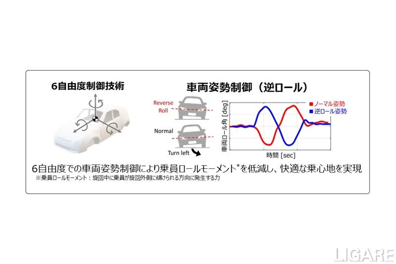 また、同技術は、例えば、自動運転車両が右に旋回する際に左方向に加速度が働き、車両の左側が下に沈むロールと呼ばれる傾きが発生するときなどに活用されるものだ。逆方向にロールさせる車両姿勢をつくることで乗員にかかる加速度を低減し、快適な乗り心地を実現するという。なお、同社は、先進的なモビリティソリューションの提供を通じて、持続可能な社会と人々の豊かな生活の実現に貢献すると述べている。