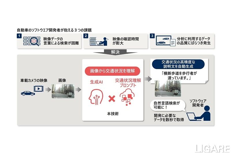 同技術は、生成AIを用いて、車載カメラの映像から、交通状況に関する高精度な説明文を自動生成するものだ。日立の自動車分野の豊富なナレッジを応用した独自のプロンプト※1により実現している。※1 ユーザーがAIに対して入力する指示文や質問文(プレスリリースより)